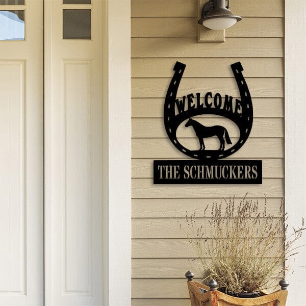 Elevate your home's entrance with this custom horseshoe welcome sign—where meaningful design meets rugged durability for the perfect blend of rustic porch sign charm and practical outdoor metal signage.